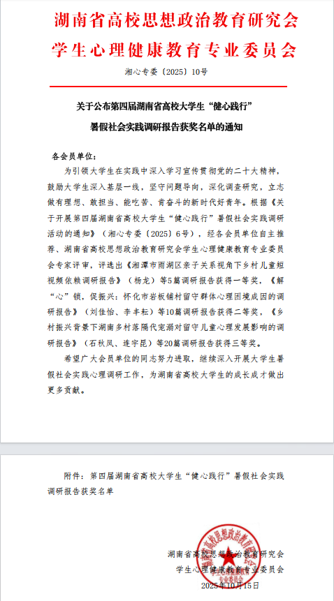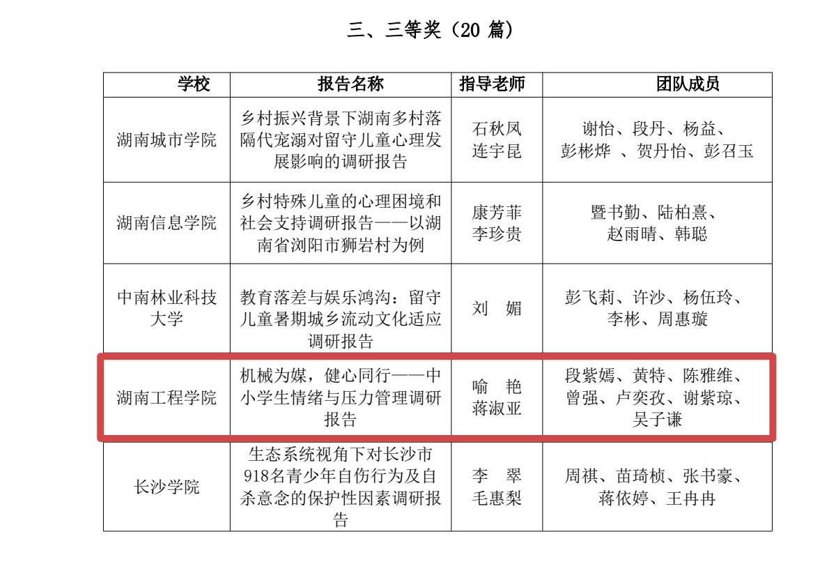 近日,第四届湖南省高校“健心践行”暑期社会实践调研报告评选结果公布。BETWAY官方网站提交的《机械为媒,健心同行——中小学生情绪与压力管理调研报告》荣获三等奖。
