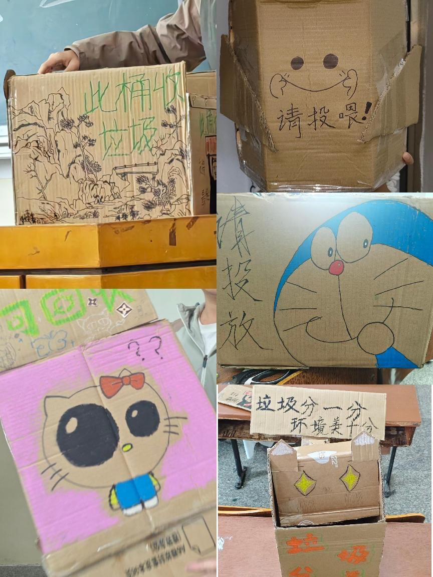 活动中,志愿者们以废旧纸箱为主要材料,运用油画棒等工具,动手制作分类垃圾桶。作品不仅造型新颖、分类明确,更实现了“变废为宝”,将环保理念落于实处。在分享环节,志愿者们依次介绍作品的设计理念与参与感受,现场同学通过举手投票选出“最具创意垃圾桶”。其中,绘有校园山水景致的垃圾桶因独特的校园情怀和审美设计获得最高票数。据悉,这批创意垃圾桶将在校运会期间投放到田径场,成为服务师生的“环保小站”。